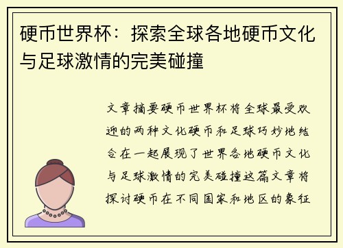 边境世界杯:跨越疆界的足球盛宴与文化碰撞的完美融合,不仅是体育领域的盛事,更是不同文化的相互交织与碰撞。随着足球的全球化进程,世界各地的球迷在这一赛事中找到共鸣,不同国家和地区的球员通过比赛与交流,不仅竞技上展开激烈对抗,还促进了文化的传递与融合。本文将从四个方面详细探讨边境世界杯如何成为跨越疆界的...
